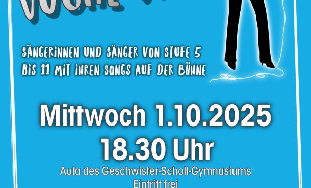 Bei allen Beteiligten steigt die Spannung, nach vielen Proben ist es am Mittwochabend endlich soweit: Um 18.30 Uhr startet das “Vocal Vibes”-Konzert mit zahlreichen Sängerinnen und Sängern aus den Stufen 5 – 11!